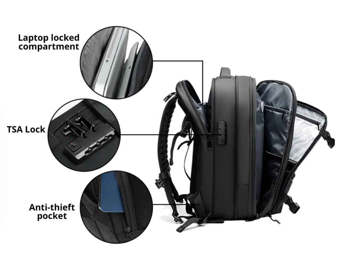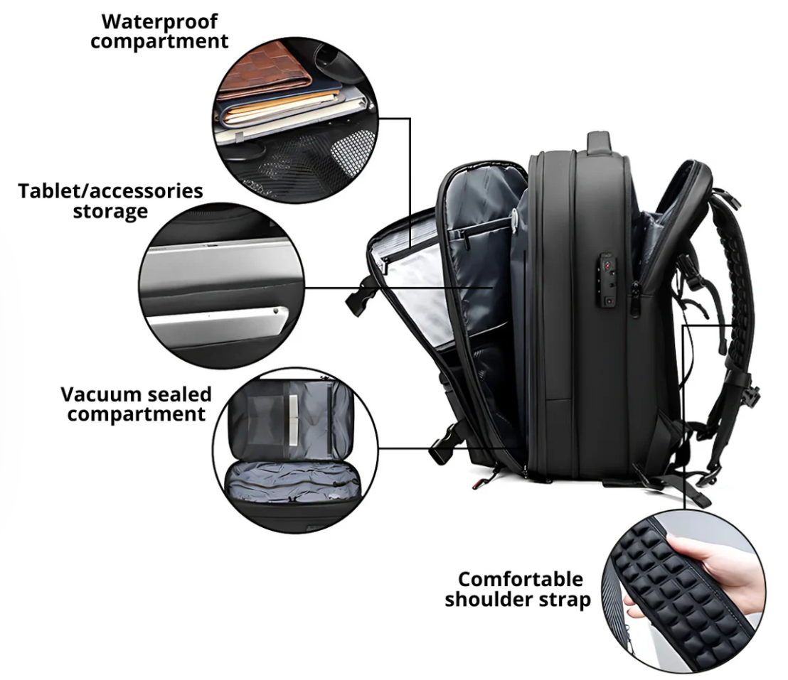 The VacPack is the backpack that makes your stuff smaller, so you can take more without the bulk. Just pack, press, and it squeezes out the extra air — giving you up to 5x more space than a normal backpack. Perfect for travel, school, or daily use.